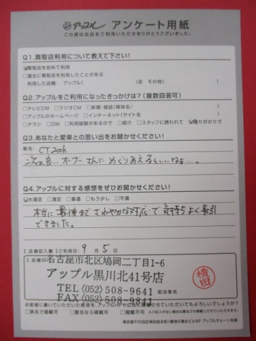 お車のご相談・ 査定だけでもOK! カンタン 入力 30秒 アップルがブランド買取始めました! お電話でも受付中! 受付時間10:00~19:00 ※毎週水曜定休日 052-508-9641 お車のご相談・ 査定だけでもOK! カンタン 入力 30秒 アップルがブランド買取始めました! お電話でも受付中! 受付時間10:00~19:00 ※毎週水曜定休日 052-508-9641 アップルがブランド買取始めました! お電話でも受付中! 受付時間10:00~19:00 ※毎週水曜定休日 052-508-9641 店舗情報 在庫車 スタッフ紹介 ブログ お客様の声 キャンペーン お得 無料査定 click お客様の声 ご記入日: 2016/09/05 K.I様 本当に最後までさわやかな対応で気持ちよく取引できました。 前へ 次へ お客様の声一覧を見る