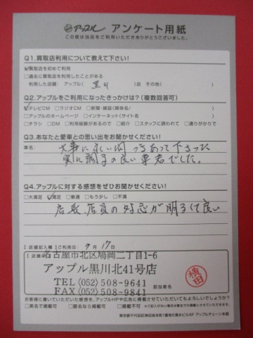 お車のご相談・ 査定だけでもOK! カンタン 入力 30秒 アップルがブランド買取始めました! お電話でも受付中! 受付時間10:00~19:00 ※毎週水曜定休日 052-508-9641 お車のご相談・ 査定だけでもOK! カンタン 入力 30秒 アップルがブランド買取始めました! お電話でも受付中! 受付時間10:00~19:00 ※毎週水曜定休日 052-508-9641 アップルがブランド買取始めました! お電話でも受付中! 受付時間10:00~19:00 ※毎週水曜定休日 052-508-9641 店舗情報 在庫車 スタッフ紹介 ブログ お客様の声 キャンペーン お得 無料査定 click お客様の声 ご記入日: 2016/09/17 O.T様 店長、店員の対応が明るくて良い。 前へ 次へ お客様の声一覧を見る