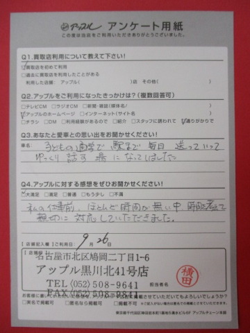 お車のご相談・ 査定だけでもOK! カンタン 入力 30秒 アップルがブランド買取始めました! お電話でも受付中! 受付時間10:00~19:00 ※毎週水曜定休日 052-508-9641 お車のご相談・ 査定だけでもOK! カンタン 入力 30秒 アップルがブランド買取始めました! お電話でも受付中! 受付時間10:00~19:00 ※毎週水曜定休日 052-508-9641 アップルがブランド買取始めました! お電話でも受付中! 受付時間10:00~19:00 ※毎週水曜定休日 052-508-9641 店舗情報 在庫車 スタッフ紹介 ブログ お客様の声 キャンペーン お得 無料査定 click お客様の声 ご記入日: 2016/09/26 Y.M様 私の仕事前、ほとんど時間が無い中、時間を考えて親切に対応して頂きました。 前へ 次へ お客様の声一覧を見る