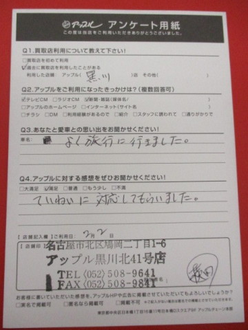 お車のご相談・ 査定だけでもOK! カンタン 入力 30秒 アップルがブランド買取始めました! お電話でも受付中! 受付時間10:00~19:00 ※毎週水曜定休日 052-508-9641 お車のご相談・ 査定だけでもOK! カンタン 入力 30秒 アップルがブランド買取始めました! お電話でも受付中! 受付時間10:00~19:00 ※毎週水曜定休日 052-508-9641 アップルがブランド買取始めました! お電話でも受付中! 受付時間10:00~19:00 ※毎週水曜定休日 052-508-9641 店舗情報 在庫車 スタッフ紹介 ブログ お客様の声 キャンペーン お得 無料査定 click お客様の声 ご記入日: 2017/02/02 H.K様 ていねいに対応してもらいました。 前へ 次へ お客様の声一覧を見る