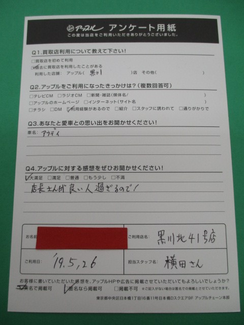 お車のご相談・ 査定だけでもOK! カンタン 入力 30秒 アップルがブランド買取始めました! お電話でも受付中! 受付時間10:00~19:00 ※毎週水曜定休日 052-508-9641 お車のご相談・ 査定だけでもOK! カンタン 入力 30秒 アップルがブランド買取始めました! お電話でも受付中! 受付時間10:00~19:00 ※毎週水曜定休日 052-508-9641 アップルがブランド買取始めました! お電話でも受付中! 受付時間10:00~19:00 ※毎週水曜定休日 052-508-9641 店舗情報 在庫車 スタッフ紹介 ブログ お客様の声 キャンペーン お得 無料査定 click お客様の声 ご記入日: 2019/05/26 T.K様 車名:アウディ 店長さんが良い人過ぎるので! 前へ 次へ お客様の声一覧を見る
