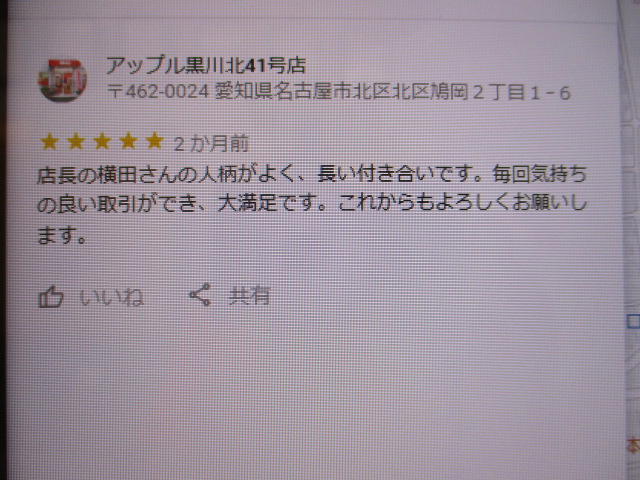お車のご相談・ 査定だけでもOK! カンタン 入力 30秒 アップルがブランド買取始めました! お電話でも受付中! 受付時間10:00~19:00 ※毎週水曜定休日 052-508-9641 お車のご相談・ 査定だけでもOK! カンタン 入力 30秒 アップルがブランド買取始めました! お電話でも受付中! 受付時間10:00~19:00 ※毎週水曜定休日 052-508-9641 アップルがブランド買取始めました! お電話でも受付中! 受付時間10:00~19:00 ※毎週水曜定休日 052-508-9641 店舗情報 在庫車 スタッフ紹介 ブログ お客様の声 キャンペーン お得 無料査定 click お客様の声 ご記入日: 2019/07/11 匿名様 店長の横田さんの人柄がよく、長い付き合いです。毎回気持ちの良い取引ができ、大満足です。これからもよろしくお願いします。 前へ 次へ お客様の声一覧を見る