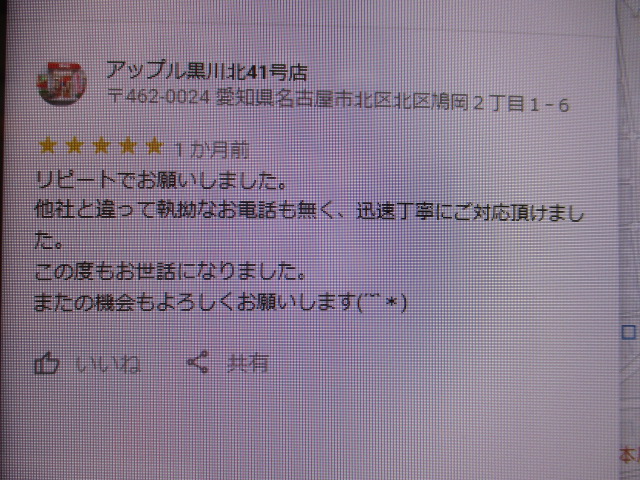 お車のご相談・ 査定だけでもOK! カンタン 入力 30秒 アップルがブランド買取始めました! お電話でも受付中! 受付時間10:00~19:00 ※毎週水曜定休日 052-508-9641 お車のご相談・ 査定だけでもOK! カンタン 入力 30秒 アップルがブランド買取始めました! お電話でも受付中! 受付時間10:00~19:00 ※毎週水曜定休日 052-508-9641 アップルがブランド買取始めました! お電話でも受付中! 受付時間10:00~19:00 ※毎週水曜定休日 052-508-9641 店舗情報 在庫車 スタッフ紹介 ブログ お客様の声 キャンペーン お得 無料査定 click お客様の声 ご記入日: 2019/08/20 匿名様 リピートでお願いしました。他社と違って執拗なお電話も無く、迅速丁寧にご対応頂けました。この度もお世話になりました。またの機会もよろしくお願いします 前へ 次へ お客様の声一覧を見る