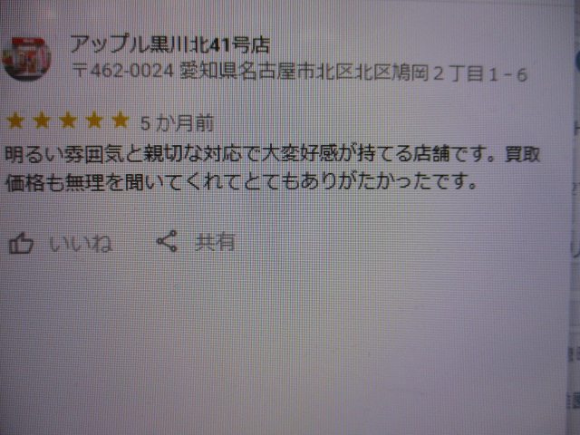 お車のご相談・ 査定だけでもOK! カンタン 入力 30秒 アップルがブランド買取始めました! お電話でも受付中! 受付時間10:00~19:00 ※毎週水曜定休日 052-508-9641 お車のご相談・ 査定だけでもOK! カンタン 入力 30秒 アップルがブランド買取始めました! お電話でも受付中! 受付時間10:00~19:00 ※毎週水曜定休日 052-508-9641 アップルがブランド買取始めました! お電話でも受付中! 受付時間10:00~19:00 ※毎週水曜定休日 052-508-9641 店舗情報 在庫車 スタッフ紹介 ブログ お客様の声 キャンペーン お得 無料査定 click お客様の声 ご記入日: 2019/10/07 匿名様 明るい雰囲気と親切な対応で大変好感が持てる店舗です。買取価格も無理を聞いてくれてとてもありがたかったです。 前へ 次へ お客様の声一覧を見る
