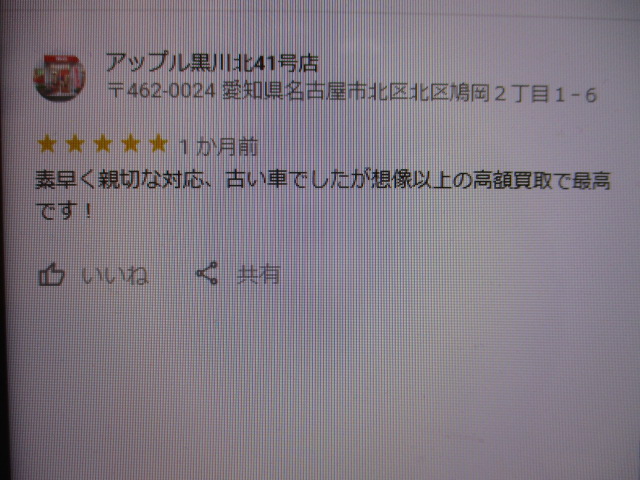 お車のご相談・ 査定だけでもOK! カンタン 入力 30秒 アップルがブランド買取始めました! お電話でも受付中! 受付時間10:00~19:00 ※毎週水曜定休日 052-508-9641 お車のご相談・ 査定だけでもOK! カンタン 入力 30秒 アップルがブランド買取始めました! お電話でも受付中! 受付時間10:00~19:00 ※毎週水曜定休日 052-508-9641 アップルがブランド買取始めました! お電話でも受付中! 受付時間10:00~19:00 ※毎週水曜定休日 052-508-9641 店舗情報 在庫車 スタッフ紹介 ブログ お客様の声 キャンペーン お得 無料査定 click お客様の声 ご記入日: 2020/02/15 匿名様 素早く親切な対応、古い車でしたが想像以上の高額買取で最高です! 前へ 次へ お客様の声一覧を見る