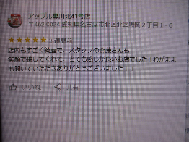 お車のご相談・ 査定だけでもOK! カンタン 入力 30秒 アップルがブランド買取始めました! お電話でも受付中! 受付時間10:00~19:00 ※毎週水曜定休日 052-508-9641 お車のご相談・ 査定だけでもOK! カンタン 入力 30秒 アップルがブランド買取始めました! お電話でも受付中! 受付時間10:00~19:00 ※毎週水曜定休日 052-508-9641 アップルがブランド買取始めました! お電話でも受付中! 受付時間10:00~19:00 ※毎週水曜定休日 052-508-9641 店舗情報 在庫車 スタッフ紹介 ブログ お客様の声 キャンペーン お得 無料査定 click お客様の声 ご記入日: 2020/02/20 匿名様 店内もすごく綺麗で、スタッフの齋藤さんも笑顔で接してくれて、とても感じが良いお店でした!わがままも聞いていただきありがとうございました!! 前へ 次へ お客様の声一覧を見る