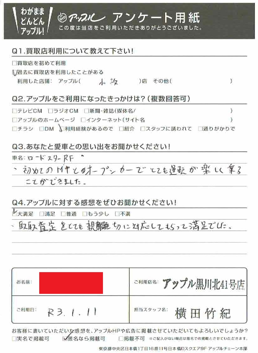お車のご相談・ 査定だけでもOK! カンタン 入力 30秒 アップルがブランド買取始めました! お電話でも受付中! 受付時間10:00~19:00 ※毎週水曜定休日 052-508-9641 お車のご相談・ 査定だけでもOK! カンタン 入力 30秒 アップルがブランド買取始めました! お電話でも受付中! 受付時間10:00~19:00 ※毎週水曜定休日 052-508-9641 アップルがブランド買取始めました! お電話でも受付中! 受付時間10:00~19:00 ※毎週水曜定休日 052-508-9641 店舗情報 在庫車 スタッフ紹介 ブログ お客様の声 キャンペーン お得 無料査定 click お客様の声 ご記入日: 2021/01/11 匿名希望ロードスター様 車名:マツダ ロードスターRF 初めてのMTとオープンカーでとても運転が楽しく乗ることができました。取取査定をとても親切に対応してもらって満足でした。 前へ 次へ お客様の声一覧を見る