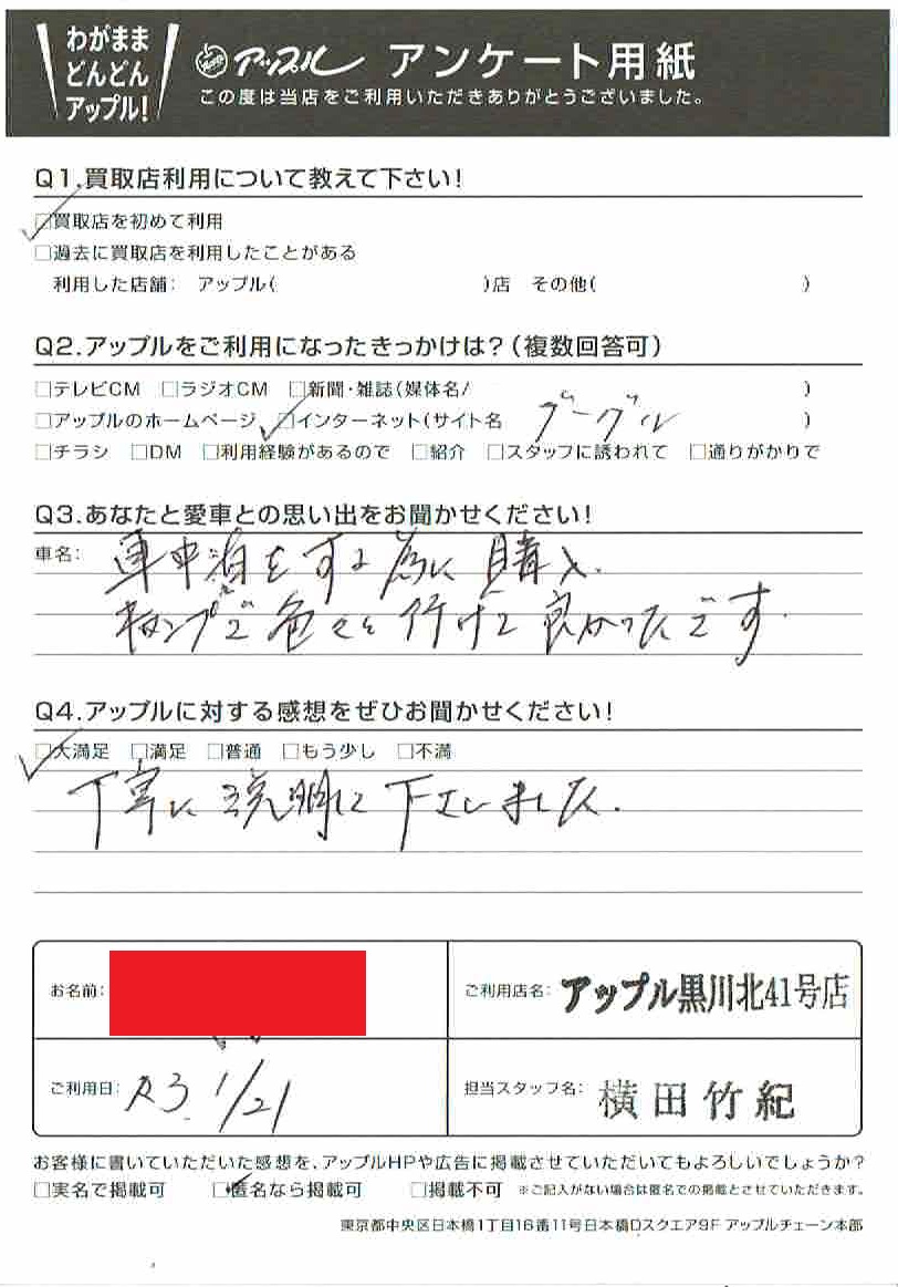 お車のご相談・ 査定だけでもOK! カンタン 入力 30秒 アップルがブランド買取始めました! お電話でも受付中! 受付時間10:00~19:00 ※毎週水曜定休日 052-508-9641 お車のご相談・ 査定だけでもOK! カンタン 入力 30秒 アップルがブランド買取始めました! お電話でも受付中! 受付時間10:00~19:00 ※毎週水曜定休日 052-508-9641 アップルがブランド買取始めました! お電話でも受付中! 受付時間10:00~19:00 ※毎週水曜定休日 052-508-9641 店舗情報 在庫車 スタッフ紹介 ブログ お客様の声 キャンペーン お得 無料査定 click お客様の声 ご記入日: 2021/01/21 匿名希望ウェイク様 車名:ダイハツ ウェイク 車中泊する為に購入。キャンプで色々と行けて良かったです。丁寧に説明して下さいました。 前へ 次へ お客様の声一覧を見る