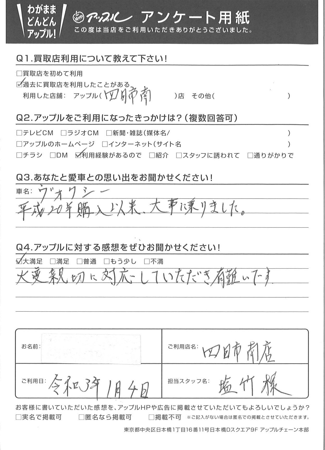 お車のご相談・ 査定だけでもOK! カンタン 入力 30秒 アップルがブランド買取始めました! お電話でも受付中! 受付時間10:00 ~ 18:30 0120-665-977 お車のご相談・ 査定だけでもOK! カンタン 入力 30秒 アップルがブランド買取始めました! お電話でも受付中! 受付時間10:00 ~ 18:30 0120-665-977 アップルがブランド買取始めました! お電話でも受付中! 受付時間10:00 ~ 18:30 0120-665-977 店舗情報 在庫車 スタッフ紹介 ブログ お客様の声 キャンペーン お得 無料査定 click お客様の声 ご記入日: 2021/01/04 匿名様 車名:トヨタ ヴォクシー 平成20年購入以来、大事に乗りました。大変親切に対応していただき有難いです。 前へ 次へ お客様の声一覧を見る