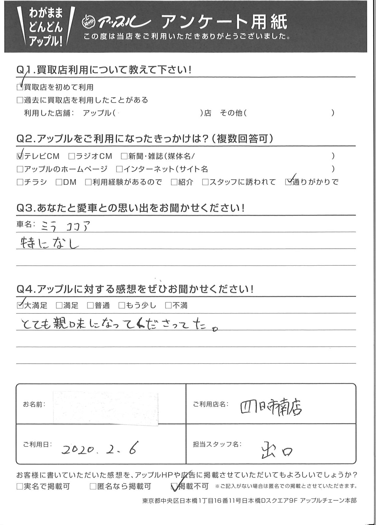 お車のご相談・ 査定だけでもOK! カンタン 入力 30秒 アップルがブランド買取始めました! お電話でも受付中! 受付時間10:00 ~ 18:30 0120-665-977 お車のご相談・ 査定だけでもOK! カンタン 入力 30秒 アップルがブランド買取始めました! お電話でも受付中! 受付時間10:00 ~ 18:30 0120-665-977 アップルがブランド買取始めました! お電話でも受付中! 受付時間10:00 ~ 18:30 0120-665-977 店舗情報 在庫車 スタッフ紹介 ブログ お客様の声 キャンペーン お得 無料査定 click お客様の声 ご記入日: 2021/02/06 匿名様 車名:ダイハツ ミラココア とても親味になってくださってた。 前へ 次へ お客様の声一覧を見る