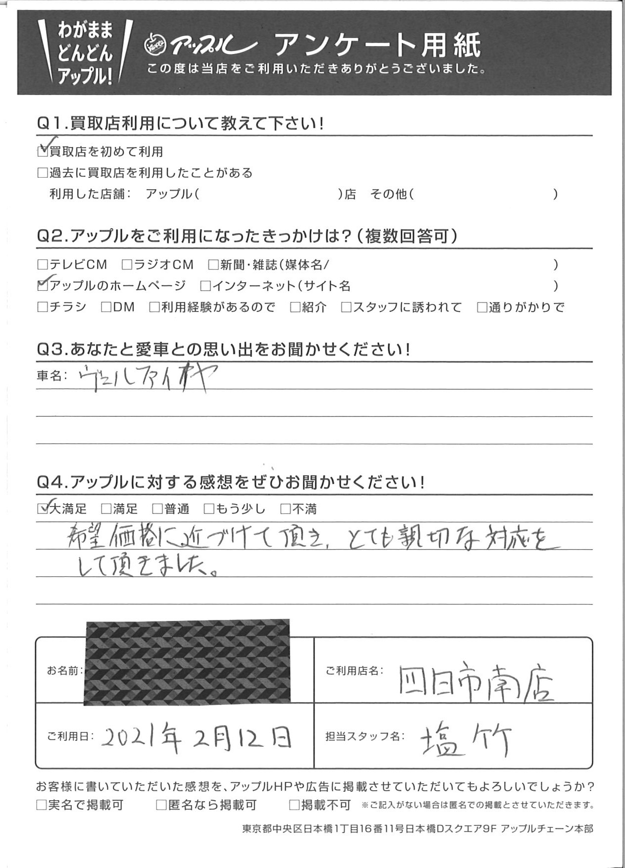 お車のご相談・ 査定だけでもOK! カンタン 入力 30秒 アップルがブランド買取始めました! お電話でも受付中! 受付時間10:00 ~ 18:30 0120-665-977 お車のご相談・ 査定だけでもOK! カンタン 入力 30秒 アップルがブランド買取始めました! お電話でも受付中! 受付時間10:00 ~ 18:30 0120-665-977 アップルがブランド買取始めました! お電話でも受付中! 受付時間10:00 ~ 18:30 0120-665-977 店舗情報 在庫車 スタッフ紹介 ブログ お客様の声 キャンペーン お得 無料査定 click お客様の声 ご記入日: 2021/02/12 匿名様 車名:トヨタ ヴェルファイア(H27年1月~のHYBRID含む) 希望価格に近づけて頂き、とても親切な対応をして頂きました。 前へ 次へ お客様の声一覧を見る