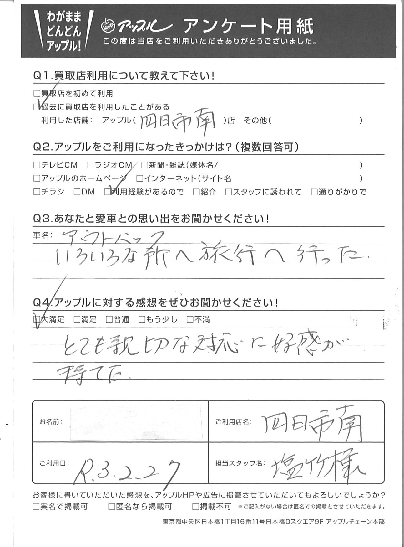 お車のご相談・ 査定だけでもOK! カンタン 入力 30秒 アップルがブランド買取始めました! お電話でも受付中! 受付時間10:00 ~ 18:30 0120-665-977 お車のご相談・ 査定だけでもOK! カンタン 入力 30秒 アップルがブランド買取始めました! お電話でも受付中! 受付時間10:00 ~ 18:30 0120-665-977 アップルがブランド買取始めました! お電話でも受付中! 受付時間10:00 ~ 18:30 0120-665-977 店舗情報 在庫車 スタッフ紹介 ブログ お客様の声 キャンペーン お得 無料査定 click お客様の声 ご記入日: 2021/02/27 匿名様 車名:スバル レガシィアウトバック(H15年10月~) アウトバック(H15年10月~) いろいろな所へ旅行へ行ったとても親切な対応に好感が持てた 前へ 次へ お客様の声一覧を見る