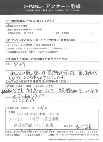 お車のご相談・ 査定だけでもOK! カンタン 入力 30秒 アップルがブランド買取始めました! お電話でも受付中! 受付時間10:00 ~ 18:30 0120-665-977 お車のご相談・ 査定だけでもOK! カンタン 入力 30秒 アップルがブランド買取始めました! お電話でも受付中! 受付時間10:00 ~ 18:30 0120-665-977 アップルがブランド買取始めました! お電話でも受付中! 受付時間10:00 ~ 18:30 0120-665-977 店舗情報 在庫車 スタッフ紹介 ブログ お客様の声 キャンペーン お得 無料査定 click お客様の声 ご記入日: 2016/03/21 F・O様 ポルテ雨の日や風の強い日 買い物とか行っても乗りおりがしやすくとても乗りやすかったです。とても対応がよくて笑顔でいれたのでここに来てよかったです。 前へ 次へ お客様の声一覧を見る