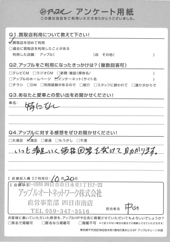 お車のご相談・ 査定だけでもOK! カンタン 入力 30秒 アップルがブランド買取始めました! お電話でも受付中! 受付時間10:00 ~ 18:30 0120-665-977 お車のご相談・ 査定だけでもOK! カンタン 入力 30秒 アップルがブランド買取始めました! お電話でも受付中! 受付時間10:00 ~ 18:30 0120-665-977 アップルがブランド買取始めました! お電話でも受付中! 受付時間10:00 ~ 18:30 0120-665-977 店舗情報 在庫車 スタッフ紹介 ブログ お客様の声 キャンペーン お得 無料査定 click お客様の声 ご記入日: 2016/10/20 N・Y様 特になしいつも満足いく価格回答を頂けて助かります。 前へ 次へ お客様の声一覧を見る