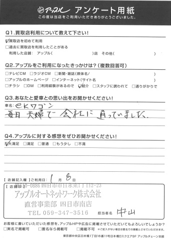 お車のご相談・ 査定だけでもOK! カンタン 入力 30秒 アップルがブランド買取始めました! お電話でも受付中! 受付時間10:00 ~ 18:30 0120-665-977 お車のご相談・ 査定だけでもOK! カンタン 入力 30秒 アップルがブランド買取始めました! お電話でも受付中! 受付時間10:00 ~ 18:30 0120-665-977 アップルがブランド買取始めました! お電話でも受付中! 受付時間10:00 ~ 18:30 0120-665-977 店舗情報 在庫車 スタッフ紹介 ブログ お客様の声 キャンペーン お得 無料査定 click お客様の声 ご記入日: 2017/01/08 T・N様 eKワゴン毎日夫婦で会社に通っていました。 前へ 次へ お客様の声一覧を見る