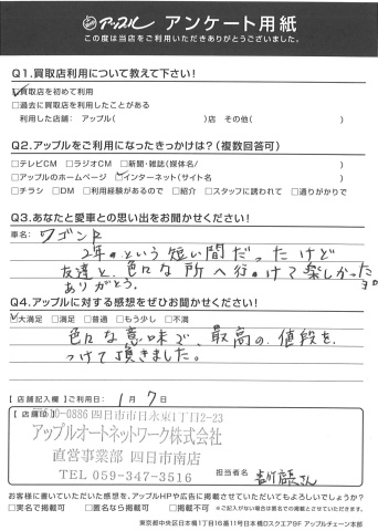 お車のご相談・ 査定だけでもOK! カンタン 入力 30秒 アップルがブランド買取始めました! お電話でも受付中! 受付時間10:00 ~ 18:30 0120-665-977 お車のご相談・ 査定だけでもOK! カンタン 入力 30秒 アップルがブランド買取始めました! お電話でも受付中! 受付時間10:00 ~ 18:30 0120-665-977 アップルがブランド買取始めました! お電話でも受付中! 受付時間10:00 ~ 18:30 0120-665-977 店舗情報 在庫車 スタッフ紹介 ブログ お客様の声 キャンペーン お得 無料査定 click お客様の声 ご記入日: 2017/01/07 K・T様 ワゴンR2年という短い間だったけど友達と、色々な所へ行けて楽しかったヨ。ありがとう。色々な意味で最高の値段をつけて頂きました。 前へ 次へ お客様の声一覧を見る