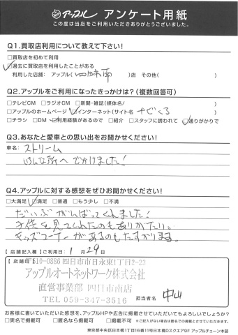 お車のご相談・ 査定だけでもOK! カンタン 入力 30秒 アップルがブランド買取始めました! お電話でも受付中! 受付時間10:00 ~ 18:30 0120-665-977 お車のご相談・ 査定だけでもOK! カンタン 入力 30秒 アップルがブランド買取始めました! お電話でも受付中! 受付時間10:00 ~ 18:30 0120-665-977 アップルがブランド買取始めました! お電話でも受付中! 受付時間10:00 ~ 18:30 0120-665-977 店舗情報 在庫車 スタッフ紹介 ブログ お客様の声 キャンペーン お得 無料査定 click お客様の声 ご記入日: 2017/01/29 J・N様 ストリームいろんな所へでかけました!だいぶがんばってくれました!子供を見てくれたのもありがたい。キッズコーナーがあるのもたすかります。 前へ 次へ お客様の声一覧を見る