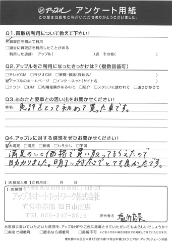 お車のご相談・ 査定だけでもOK! カンタン 入力 30秒 アップルがブランド買取始めました! お電話でも受付中! 受付時間10:00 ~ 18:30 0120-665-977 お車のご相談・ 査定だけでもOK! カンタン 入力 30秒 アップルがブランド買取始めました! お電話でも受付中! 受付時間10:00 ~ 18:30 0120-665-977 アップルがブランド買取始めました! お電話でも受付中! 受付時間10:00 ~ 18:30 0120-665-977 店舗情報 在庫車 スタッフ紹介 ブログ お客様の声 キャンペーン お得 無料査定 click お客様の声 ご記入日: 2017/03/03 Y・I様 免許をとって初めて買った車です。満足のいく価格で買い取ってもらえたので助かりました。明るい対応でとても良かったです。 前へ 次へ お客様の声一覧を見る