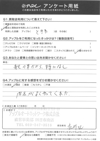 お車のご相談・ 査定だけでもOK! カンタン 入力 30秒 アップルがブランド買取始めました! お電話でも受付中! 受付時間10:00 ~ 18:30 0120-665-977 お車のご相談・ 査定だけでもOK! カンタン 入力 30秒 アップルがブランド買取始めました! お電話でも受付中! 受付時間10:00 ~ 18:30 0120-665-977 アップルがブランド買取始めました! お電話でも受付中! 受付時間10:00 ~ 18:30 0120-665-977 店舗情報 在庫車 スタッフ紹介 ブログ お客様の声 キャンペーン お得 無料査定 click お客様の声 ご記入日: 2017/03/06 Y・Y様 親の車だから、特になし店長がよくやってくれた 前へ 次へ お客様の声一覧を見る