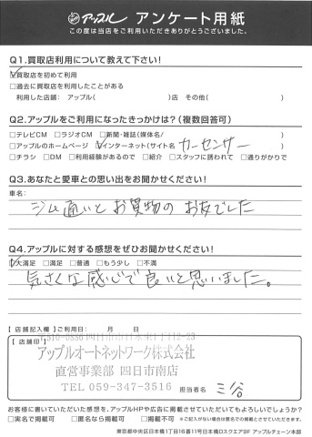 お車のご相談・ 査定だけでもOK! カンタン 入力 30秒 アップルがブランド買取始めました! お電話でも受付中! 受付時間10:00 ~ 18:30 0120-665-977 お車のご相談・ 査定だけでもOK! カンタン 入力 30秒 アップルがブランド買取始めました! お電話でも受付中! 受付時間10:00 ~ 18:30 0120-665-977 アップルがブランド買取始めました! お電話でも受付中! 受付時間10:00 ~ 18:30 0120-665-977 店舗情報 在庫車 スタッフ紹介 ブログ お客様の声 キャンペーン お得 無料査定 click お客様の声 ご記入日: 2017/02/16 A・A様 ジム通いとお買物のお友でした気さくな感じで良いと思いました。 前へ 次へ お客様の声一覧を見る