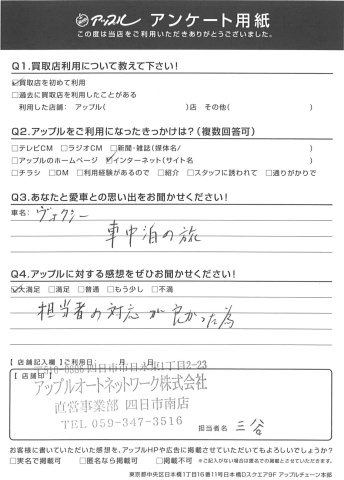 お車のご相談・ 査定だけでもOK! カンタン 入力 30秒 アップルがブランド買取始めました! お電話でも受付中! 受付時間10:00 ~ 18:30 0120-665-977 お車のご相談・ 査定だけでもOK! カンタン 入力 30秒 アップルがブランド買取始めました! お電話でも受付中! 受付時間10:00 ~ 18:30 0120-665-977 アップルがブランド買取始めました! お電話でも受付中! 受付時間10:00 ~ 18:30 0120-665-977 店舗情報 在庫車 スタッフ紹介 ブログ お客様の声 キャンペーン お得 無料査定 click お客様の声 ご記入日: 2017/02/09 H・T様 ヴォクシー車中泊の旅担当者の対応が良かった為 前へ 次へ お客様の声一覧を見る