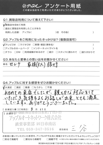 お車のご相談・ 査定だけでもOK! カンタン 入力 30秒 アップルがブランド買取始めました! お電話でも受付中! 受付時間10:00 ~ 18:30 0120-665-977 お車のご相談・ 査定だけでもOK! カンタン 入力 30秒 アップルがブランド買取始めました! お電話でも受付中! 受付時間10:00 ~ 18:30 0120-665-977 アップルがブランド買取始めました! お電話でも受付中! 受付時間10:00 ~ 18:30 0120-665-977 店舗情報 在庫車 スタッフ紹介 ブログ お客様の声 キャンペーン お得 無料査定 click お客様の声 ご記入日: 2017/03/11 K・F様 セレナ家族(5人)旅行初めての来店でしたが、親切な対応をしていただき気持ちよくお話が出来、とても満足しています。ありがとうございました。 前へ 次へ お客様の声一覧を見る