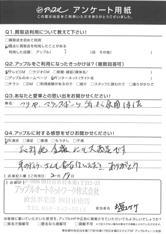 お車のご相談・ 査定だけでもOK! カンタン 入力 30秒 アップルがブランド買取始めました! お電話でも受付中! 受付時間10:00 ~ 18:30 0120-665-977 お車のご相談・ 査定だけでもOK! カンタン 入力 30秒 アップルがブランド買取始めました! お電話でも受付中! 受付時間10:00 ~ 18:30 0120-665-977 アップルがブランド買取始めました! お電話でも受付中! 受付時間10:00 ~ 18:30 0120-665-977 店舗情報 在庫車 スタッフ紹介 ブログ お客様の声 キャンペーン お得 無料査定 click お客様の声 ご記入日: 2017/02/19 Y・N様 つりや、マリンスポーツ等、よく使用しました応対他 金額にも大満足です。車のディラーさんも紹介していただき、ありがとう。 前へ 次へ お客様の声一覧を見る