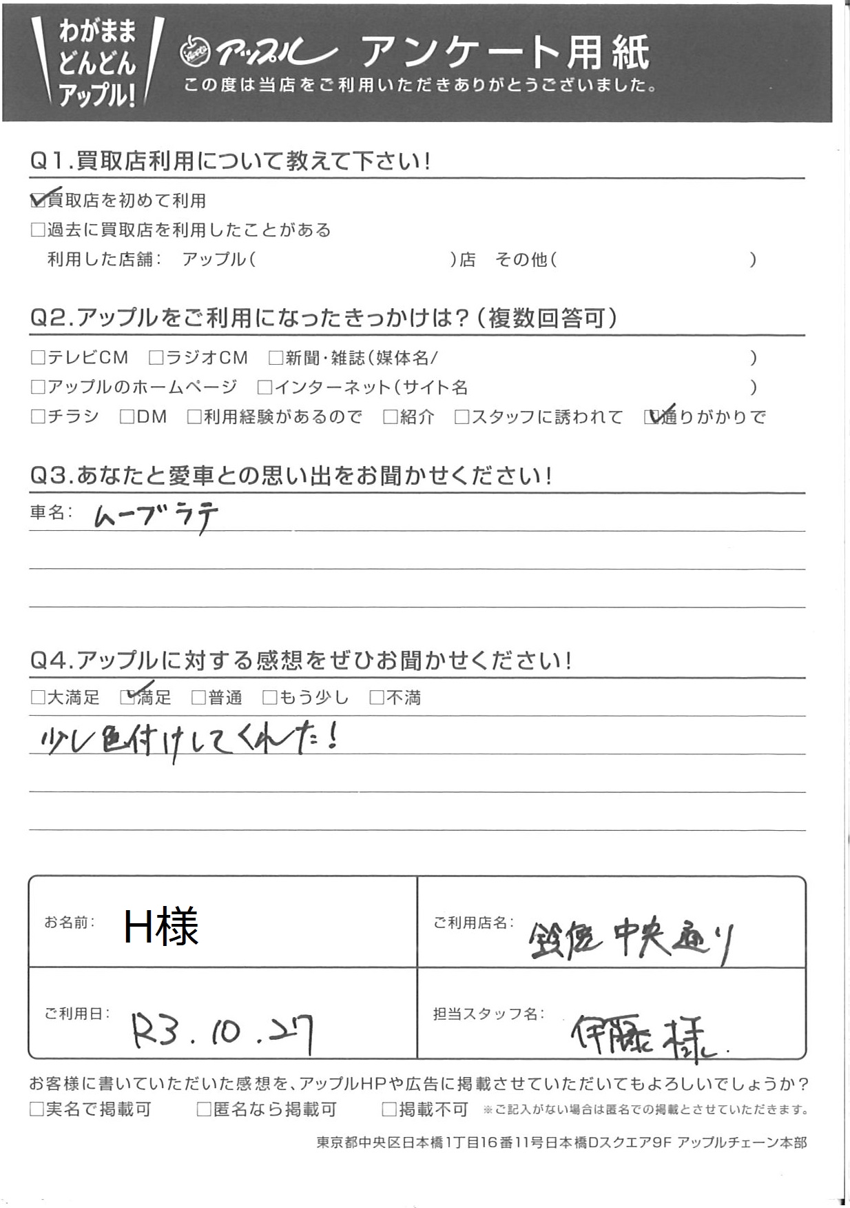 お車のご相談・ 査定だけでもOK! カンタン 入力 30秒 アップルがブランド買取始めました! お電話でも受付中! 受付時間 10:00 ~ 18:30 0120-866-446 お車のご相談・ 査定だけでもOK! カンタン 入力 30秒 アップルがブランド買取始めました! お電話でも受付中! 受付時間 10:00 ~ 18:30 0120-866-446 アップルがブランド買取始めました! お電話でも受付中! 受付時間 10:00 ~ 18:30 0120-866-446 店舗情報 在庫車 スタッフ紹介 ブログ お客様の声 キャンペーン お得 無料査定 click お客様の声 ご記入日: 2021/10/27 H様 車名:ダイハツ ムーヴラテ ◎あなたと愛車との思い出をお聞かせください!車名:ムーブラテ◎アップルに対する感想をぜひお聞かせください!少し色付けしてくれた! 前へ 次へ お客様の声一覧を見る