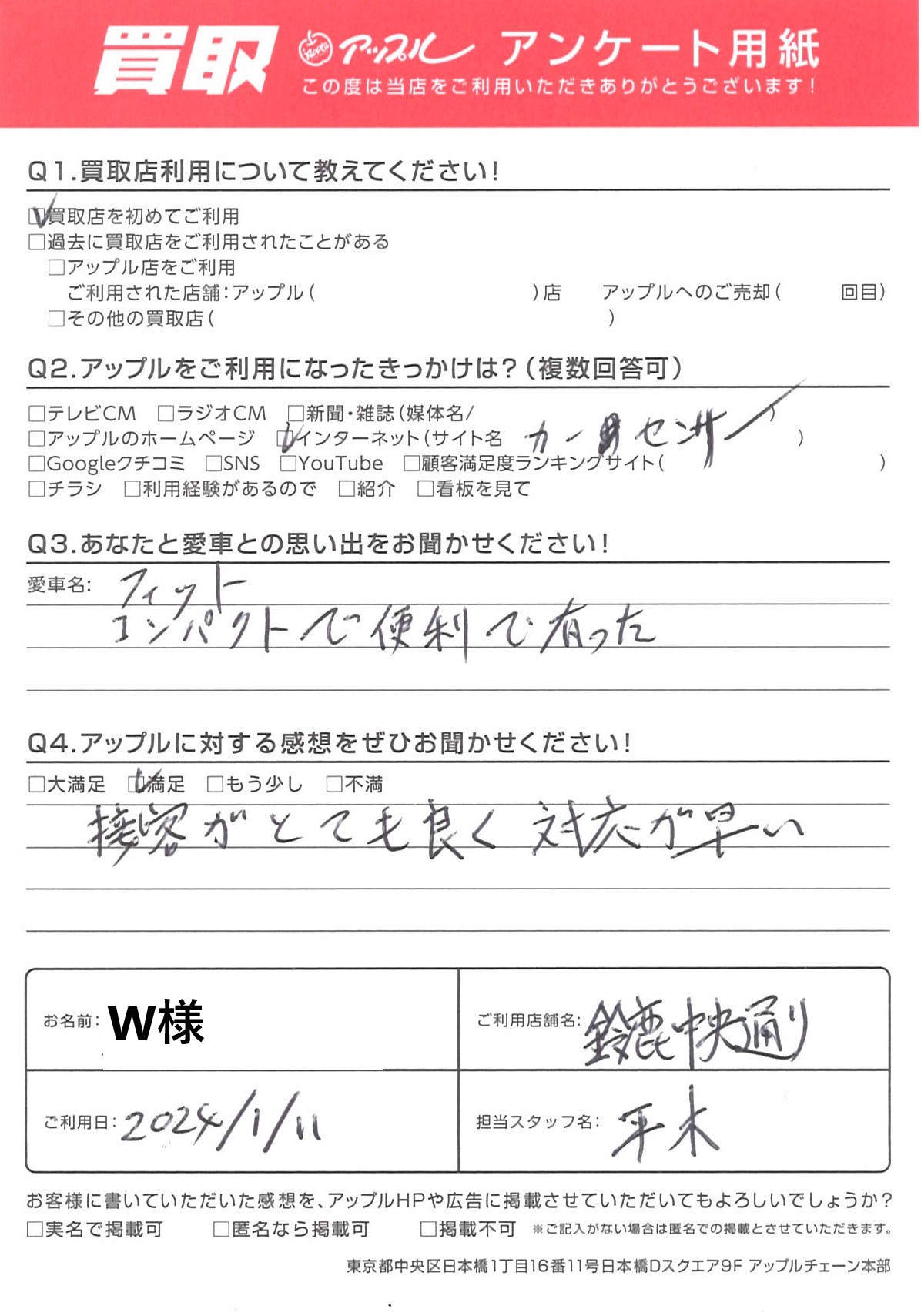 お車のご相談・ 査定だけでもOK! カンタン 入力 30秒 アップルがブランド買取始めました! お電話でも受付中! 受付時間 10:00 ~ 18:30 0120-866-446 お車のご相談・ 査定だけでもOK! カンタン 入力 30秒 アップルがブランド買取始めました! お電話でも受付中! 受付時間 10:00 ~ 18:30 0120-866-446 アップルがブランド買取始めました! お電話でも受付中! 受付時間 10:00 ~ 18:30 0120-866-446 店舗情報 在庫車 スタッフ紹介 ブログ お客様の声 キャンペーン お得 無料査定 click お客様の声 ご記入日: 2024/01/11 W様 ◎あなたと愛車との思い出をお聞かせください! 愛車名:フィットコンパクトで便利で有った◎アップルに対する感想をぜひお聞かせください! 満足接客がとても良く対応が早い 前へ 次へ お客様の声一覧を見る