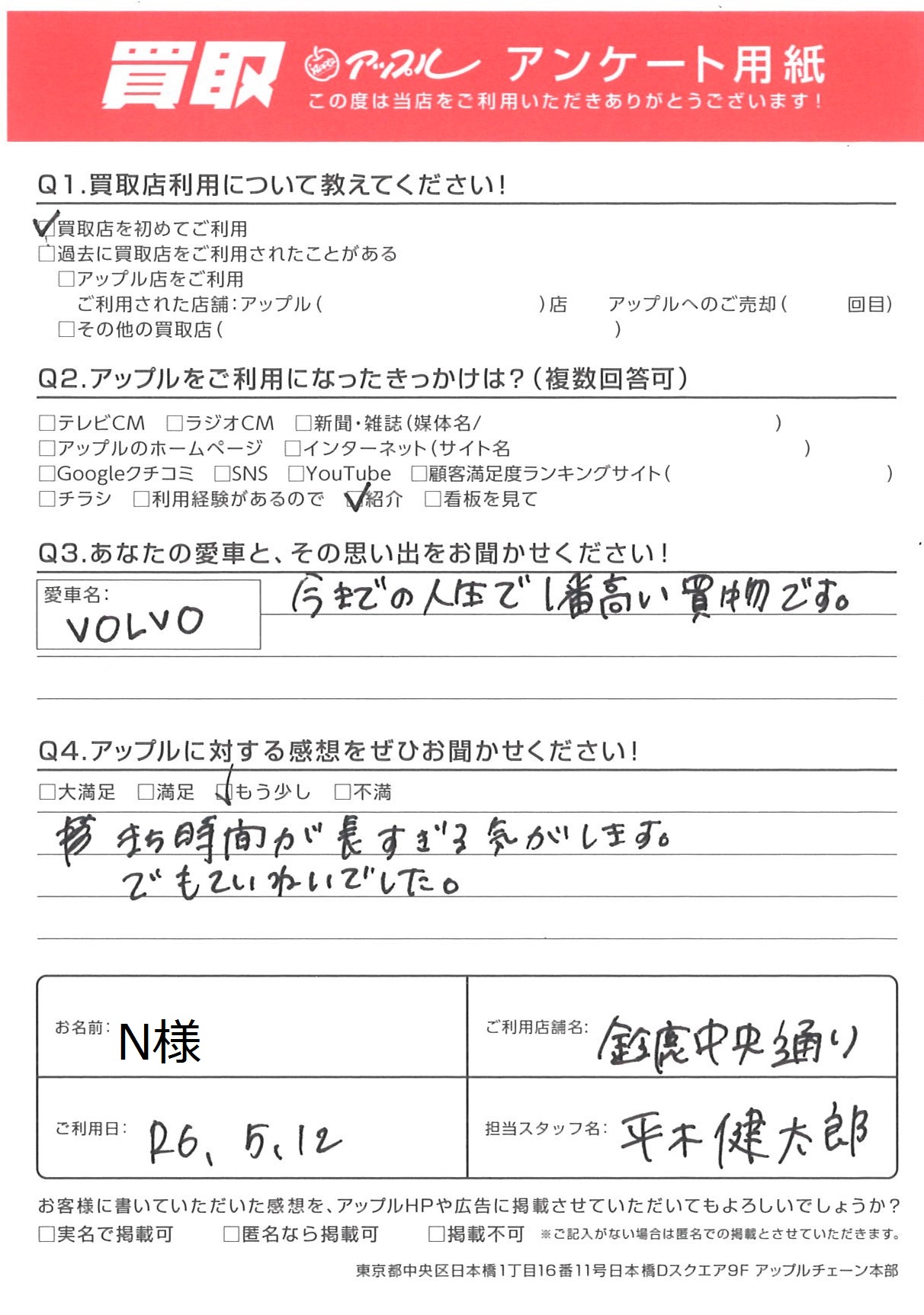 お車のご相談・ 査定だけでもOK! カンタン 入力 30秒 アップルがブランド買取始めました! お電話でも受付中! 受付時間 10:00 ~ 18:30 0120-866-446 お車のご相談・ 査定だけでもOK! カンタン 入力 30秒 アップルがブランド買取始めました! お電話でも受付中! 受付時間 10:00 ~ 18:30 0120-866-446 アップルがブランド買取始めました! お電話でも受付中! 受付時間 10:00 ~ 18:30 0120-866-446 店舗情報 在庫車 スタッフ紹介 ブログ お客様の声 キャンペーン お得 無料査定 click お客様の声 ご記入日: 2024/05/12 N様 ◎あなたの愛車と、その思い出をおきかせください!◎ 愛車名:VOLVO今までの人生で一番高い買い物です。◎アップルに対する感想をぜひお聞かせください!◎ もう少しまち時間が長すぎる気がします。でもていねいでした。 前へ 次へ お客様の声一覧を見る