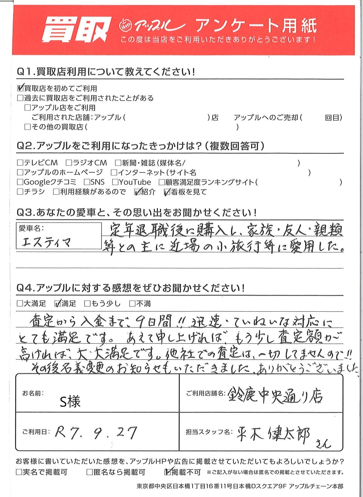 あえて申し上げれば、もう少し査定額が高ければ、大・大満足です。