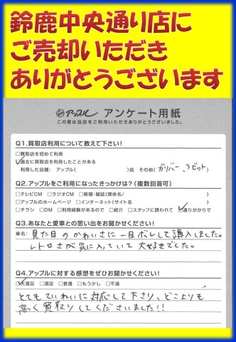 お車のご相談・ 査定だけでもOK! カンタン 入力 30秒 アップルがブランド買取始めました! お電話でも受付中! 受付時間 10:00 ~ 18:30 0120-866-446 お車のご相談・ 査定だけでもOK! カンタン 入力 30秒 アップルがブランド買取始めました! お電話でも受付中! 受付時間 10:00 ~ 18:30 0120-866-446 アップルがブランド買取始めました! お電話でも受付中! 受付時間 10:00 ~ 18:30 0120-866-446 店舗情報 在庫車 スタッフ紹介 ブログ お客様の声 キャンペーン お得 無料査定 click お客様の声 ご記入日: 2016/10/23 S.T様 当店をご利用頂きまして、誠にありがとうございます。またのご来店をスタッフ一同、心よりお待ちしております。 前へ 次へ お客様の声一覧を見る
