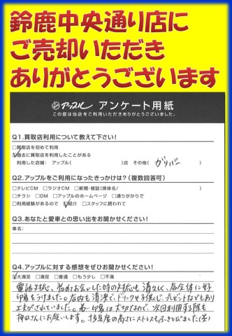 お車のご相談・ 査定だけでもOK! カンタン 入力 30秒 アップルがブランド買取始めました! お電話でも受付中! 受付時間 10:00 ~ 18:30 0120-866-446 お車のご相談・ 査定だけでもOK! カンタン 入力 30秒 アップルがブランド買取始めました! お電話でも受付中! 受付時間 10:00 ~ 18:30 0120-866-446 アップルがブランド買取始めました! お電話でも受付中! 受付時間 10:00 ~ 18:30 0120-866-446 店舗情報 在庫車 スタッフ紹介 ブログ お客様の声 キャンペーン お得 無料査定 click お客様の声 ご記入日: 2017/01/07 S.T様 当店をご利用頂きまして、誠にありがとうございます。またのご来店をスタッフ一同、心よりお待ちしております。 前へ 次へ お客様の声一覧を見る