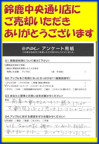 お車のご相談・ 査定だけでもOK! カンタン 入力 30秒 アップルがブランド買取始めました! お電話でも受付中! 受付時間 10:00 ~ 18:30 0120-866-446 お車のご相談・ 査定だけでもOK! カンタン 入力 30秒 アップルがブランド買取始めました! お電話でも受付中! 受付時間 10:00 ~ 18:30 0120-866-446 アップルがブランド買取始めました! お電話でも受付中! 受付時間 10:00 ~ 18:30 0120-866-446 店舗情報 在庫車 スタッフ紹介 ブログ お客様の声 キャンペーン お得 無料査定 click お客様の声 ご記入日: 2017/02/11 S.H様 当店をご利用頂きまして、誠にありがとうございます。またのご来店をスタッフ一同、心よりお待ちしております。 前へ 次へ お客様の声一覧を見る