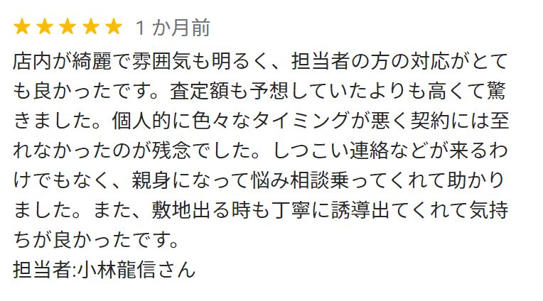 店内が綺麗で雰囲気も明るく、担当者の方の対応がとても良かったです。査定額も予想していたよりも高くて驚きました。個人的に色々なタイミングが悪く契約には至れなかったのが残念でした。しつこい連絡などが来るわけでもなく、親身になって悩み相談乗ってくれて助かりました。また、敷地出る時も丁寧に誘導出てくれて気持ちが良かったです。