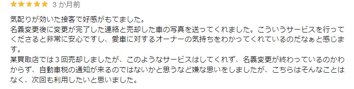 某買取店では3回売却しましたが、このようなサービスはしてくれず、名義変更が終わっているのかわからず、自動車税の通知が来るのではないかと思うなど嫌な思いをしましたが、こちらはそんなことはなく、次回も利用したいと思いました。