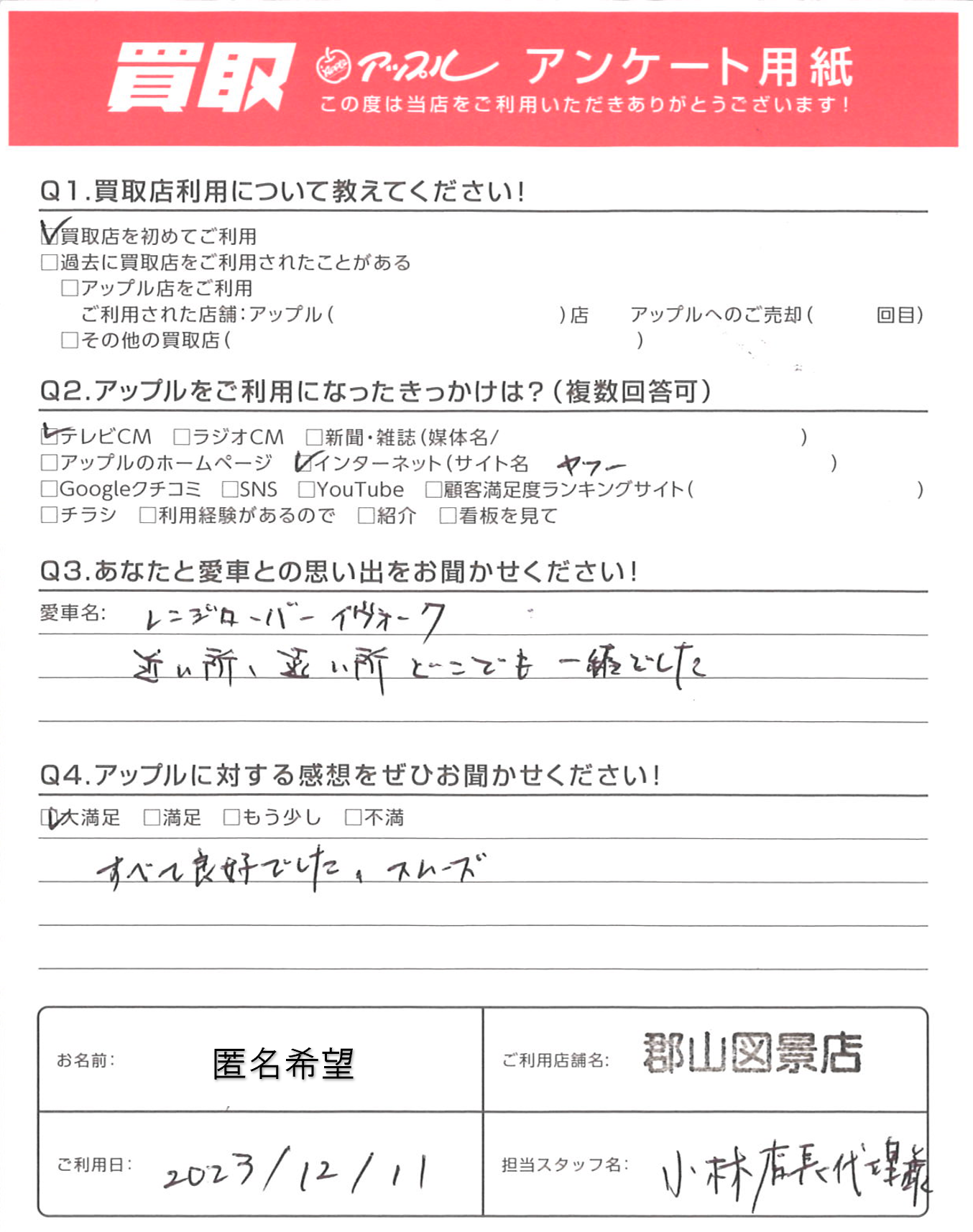 匿名希望様 車名:ランドローバー レンジローバーイヴォーク