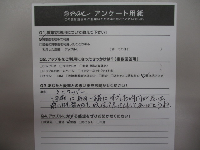 お車のご相談・ 査定だけでもOK! カンタン 入力 30秒 アップルがブランド買取始めました! お電話でも受付中! 受付時間10:00 ~ 12:00 13:00 ~ 18:00 024-983-3226 お車のご相談・ 査定だけでもOK! カンタン 入力 30秒 アップルがブランド買取始めました! お電話でも受付中! 受付時間10:00 ~ 12:00 13:00 ~ 18:00 024-983-3226 アップルがブランド買取始めました! お電話でも受付中! 受付時間10:00 ~ 12:00 13:00 ~ 18:00 024-983-3226 店舗情報 在庫車 スタッフ紹介 ブログ お客様の声 キャンペーン 無料査定 click お客様の声 ご記入日: 2020/02/29 A・S様 車名:ミニ ミニ 沢山の思い出を共有した相棒だったようです(^^)長く愛されましたね!弊社をご利用いただきありがとうございました。 前へ 次へ お客様の声一覧を見る