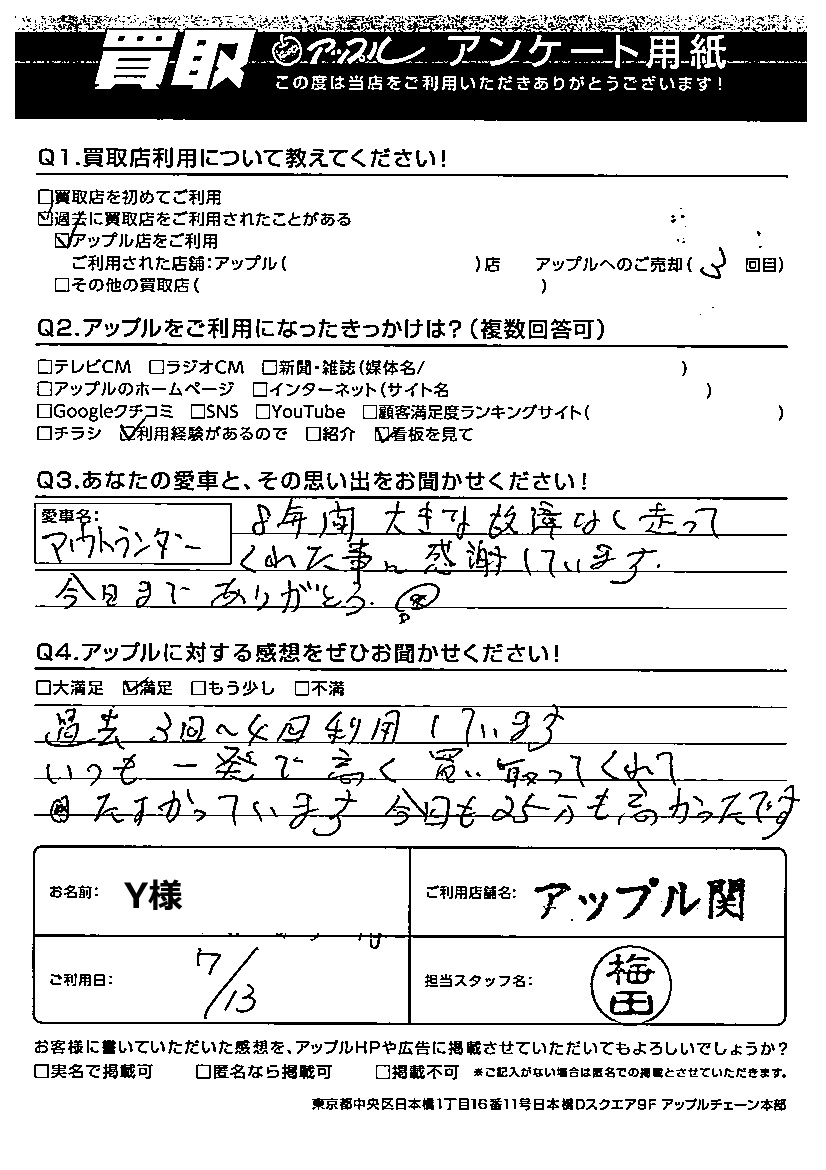 いつも一発で高く買い取ってくれてたすかっています。今回も25万も高かったです。