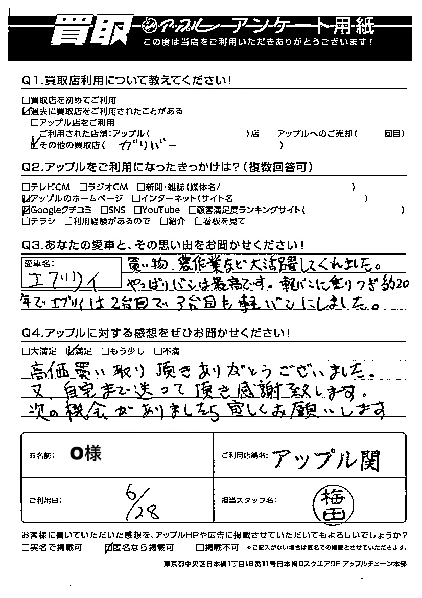 O様 車名:スズキ エブリイ