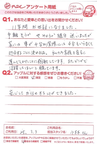 11年間もの間、M様ご家族の為に働いたおクルマをご売却頂きまして、ありがとうございました。