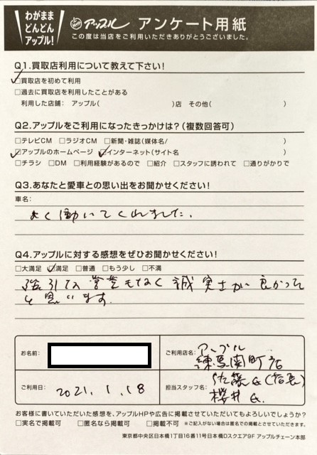 お車のご相談・ 査定だけでもOK! カンタン 入力 30秒 アップルがブランド買取始めました! お電話でも受付中! 受付時間10:00 ~ 19:00 03-5903-8567 お車のご相談・ 査定だけでもOK! カンタン 入力 30秒 アップルがブランド買取始めました! お電話でも受付中! 受付時間10:00 ~ 19:00 03-5903-8567 アップルがブランド買取始めました! お電話でも受付中! 受付時間10:00 ~ 19:00 03-5903-8567 店舗情報 在庫車 スタッフ紹介 ブログ お客様の声 キャンペーン お得 無料査定 click お客様の声 ご記入日: 2021/01/18 東京都西東京市 M・S様 車名:スズキ スイフト お車:スイフト Q.愛車との思い出は? A.よく働いてくれました。Q.アップルの感想は? A.満足:強引な営業もなく誠実さが良かったと思います。 前へ 次へ お客様の声一覧を見る