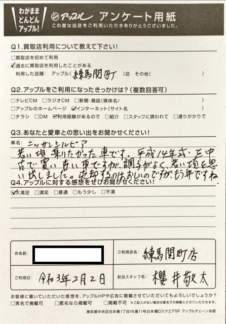 お車のご相談・ 査定だけでもOK! カンタン 入力 30秒 アップルがブランド買取始めました! お電話でも受付中! 受付時間10:00 ~ 19:00 03-5903-8567 お車のご相談・ 査定だけでもOK! カンタン 入力 30秒 アップルがブランド買取始めました! お電話でも受付中! 受付時間10:00 ~ 19:00 03-5903-8567 アップルがブランド買取始めました! お電話でも受付中! 受付時間10:00 ~ 19:00 03-5903-8567 店舗情報 在庫車 スタッフ紹介 ブログ お客様の声 キャンペーン お得 無料査定 click お客様の声 ご記入日: 2021/02/02 東京都杉並区 O・Y様 車名:日産 シルビア お車:シルビア Q.愛車との思い出は? A.若い頃乗りたかった車です。平成14年式を中古で買い古い車ですが、調子がよく若い頃を思い出しました。売却するのはおしいですが、もう年ですね。Q.アップルの感想は? A.大満足 前へ 次へ お客様の声一覧を見る