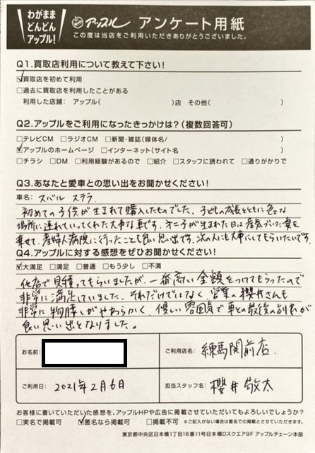 お車:ステラ Q.愛車との思い出は? A.初めての子供が生まれて購入したものでした。子どもの成長とともに色々な場所に連れていってくれた大事な車です。第二子が生まれた日は産気づいた妻を乗せて産婦人病院に行ったことも良い思い出です。次の人にも大事にしてもらいたいです。Q.アップルの感想は? A.大満足:他店で見積ってもらいましたが、一番高い金額をつけてもらったので非常に満足していました。それだけではなく、営業の櫻井さんも非常に物腰しがやわらかく、優しい雰囲気で車との最後の別れが良い思い出となりました。