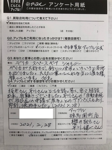 お車:デリカスペースギアシャモニー Q.愛車との思い出は? A.デリカが大好きで釣りに使用。いろいろと各地を巡りました。大切に乗ってくれる方に渡る様、願っております。 Q.アップルの感想は? A.大満足:櫻井さん、平川さん、とても話し易く、色々相談出来、有難うございました。平川さんの「自動車税が当日迄の申請で戻る」とのアドバイスもあり、即刻決めました。