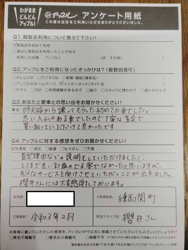 お車:マーチ Q.愛車との思い出は? A.姉夫婦から譲ってもらった初めての車でした。思い入れのある車でしたので丁寧な査定で買い取っていただけて良かったです。 Q.アップルの感想は? A.大満足:査定理由などの説明もしていただけましたし、そこまで良い利益のでる客でなかったと思いますが、充分なサービスを受けさせていただくことが出来ました。櫻井さんには大変感謝しております。