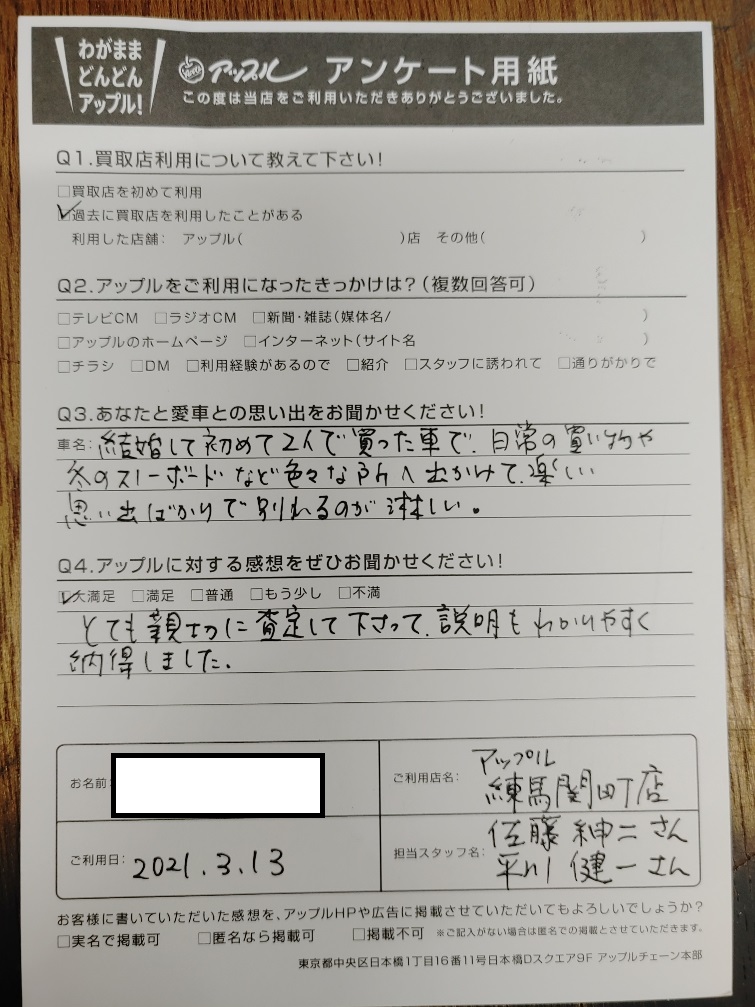 お車のご相談・ 査定だけでもOK! カンタン 入力 30秒 アップルがブランド買取始めました! お電話でも受付中! 受付時間10:00 ~ 19:00 03-5903-8567 お車のご相談・ 査定だけでもOK! カンタン 入力 30秒 アップルがブランド買取始めました! お電話でも受付中! 受付時間10:00 ~ 19:00 03-5903-8567 アップルがブランド買取始めました! お電話でも受付中! 受付時間10:00 ~ 19:00 03-5903-8567 店舗情報 在庫車 スタッフ紹介 ブログ お客様の声 キャンペーン お得 無料査定 click お客様の声 ご記入日: 2021/03/13 東京都中野区 S・A様 車名:トヨタ ヴァンガード お車:ヴァンガード Q.愛車との思い出は? A.結婚して初めて2人で買った車で、日常の買い物や冬のスノーボードなど色々な所へ出かけて楽しい思い出ばかりで別れるのが淋しい。 Q.アップルの感想は? A.大満足:とても親切に査定して下さって説明もわかりやすく納得しました。 前へ 次へ お客様の声一覧を見る