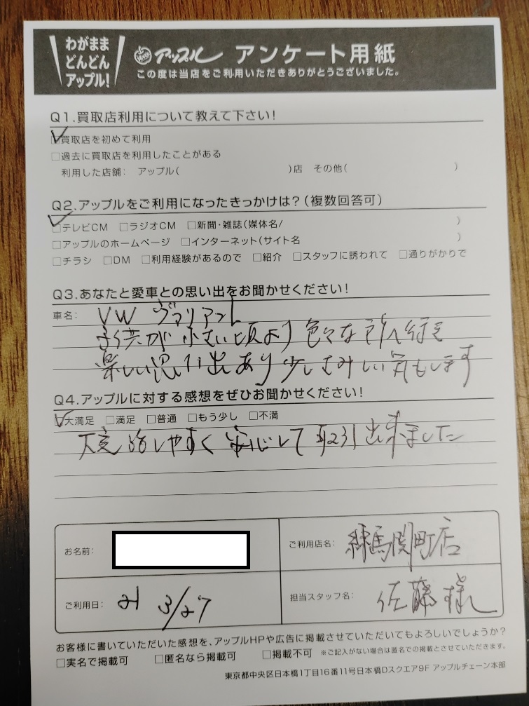 お車のご相談・ 査定だけでもOK! カンタン 入力 30秒 アップルがブランド買取始めました! お電話でも受付中! 受付時間10:00 ~ 19:00 03-5903-8567 お車のご相談・ 査定だけでもOK! カンタン 入力 30秒 アップルがブランド買取始めました! お電話でも受付中! 受付時間10:00 ~ 19:00 03-5903-8567 アップルがブランド買取始めました! お電話でも受付中! 受付時間10:00 ~ 19:00 03-5903-8567 店舗情報 在庫車 スタッフ紹介 ブログ お客様の声 キャンペーン お得 無料査定 click お客様の声 ご記入日: 2021/01/09 東京都練馬区 Y・O様 車名:フォルクスワーゲン ゴルフヴァリアント お車:ゴルフヴァリアント Q.愛車との思い出は? A.子供が小さい頃より色々な所へ行き楽しい思い出あり少しさみしい気もします Q.アップルの感想は? A.大満足:大変話しやすく安心して取引出来ました 前へ 次へ お客様の声一覧を見る