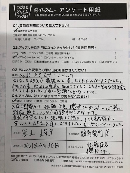 お車:アウディA5スポーツバック Q.愛車との思い出は? A.亡くなった祖父が最後にと買ってくれたのがA5でした。初めての車、初めての外車と初めて尽くしでしたが、色々な経験をさせてくれました。本当に感謝しかないです Q.アップルの感想は? A.大満足:入店段階から佐藤店長、櫻井さんの2人には丁寧に対応頂き、心から感謝申し上げます。査定内容も1つ1つ説明して頂き、とても納得かつ安心してA5をお渡しできました。ありがとうございました。