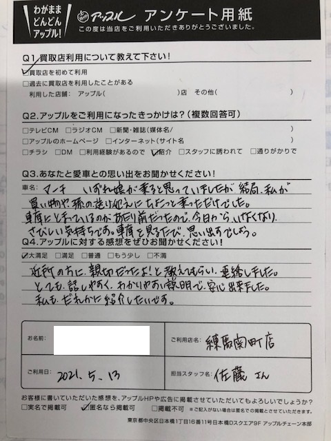 お車:マーチ Q.愛車との思い出は? Aいずれ娘が乗ると思っていましたが、結局私が買い物や、孫の送り迎えにちょこっと乗っただけでした。車庫にとまっているのがあたり前だったので、今日からいなくなりさびしい気持ちです。車庫を見るたび思い出すでしょう。 Q.アップルの感想は? A.大満足:近所の方に、親切だったよ!と教えてもらい連絡しました。とても話しやすくわかりやすい説明で、安心出来ました。私もだれかに紹介したいです。
